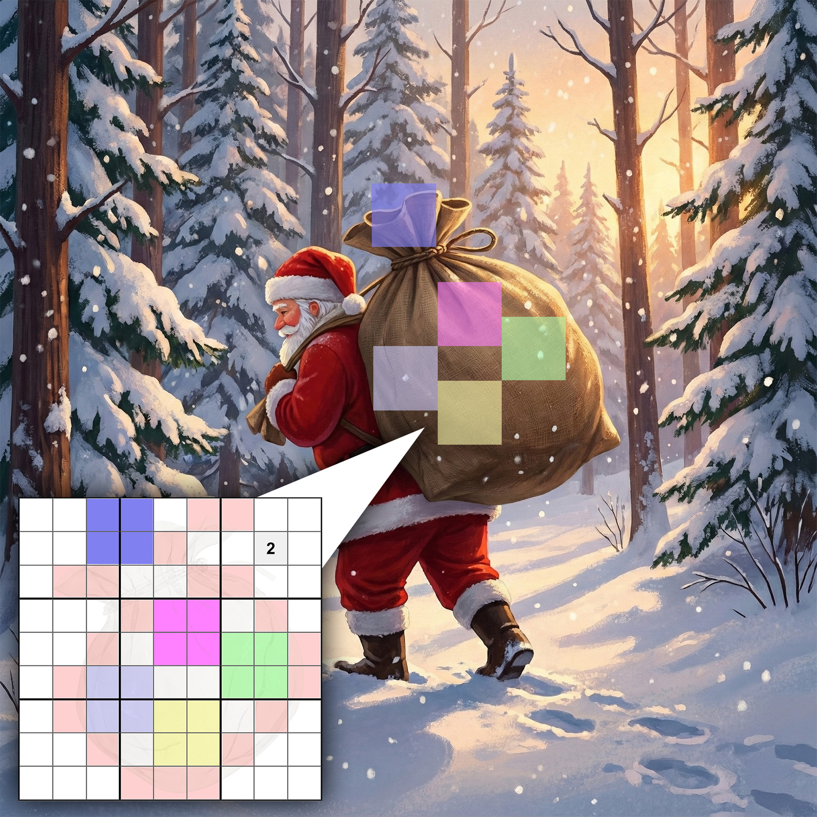 Im Sack des Weihnachtsmanns findest du 5 bunte Geschenke (2x2 Zellen). In jeder Geschenk-Box haben beide Diagonalen die gleiche Summe, jedoch mindestens 7. Jede Geschenk-Box hat eine andere Diagonalensumme. Entscheide dich für den Schwierigkeitsgrad des Sudokus, indem du dir die Diagonalsumme einer oder zweier Geschenk-Boxen verraten lässt: